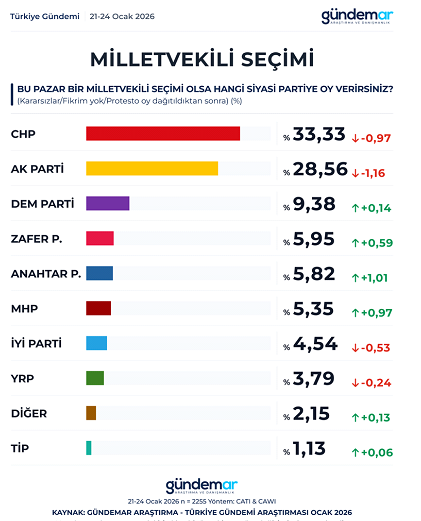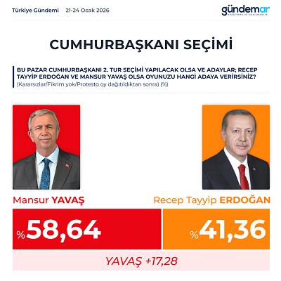 CEZAEVİNDEN 16 PUAN FARK ATTIGÜNDEMAR tarafından yapılan son anketin sonuçları açıklandı. 21-24 Ocak 2026 tarihleri arasında yapılan Cumhurbaşkanlığına ilişkin olası ikinci tur senaryolarında İmamoğlu, Erdoğan karşısında 16,14 puanlık bir farkla önde yer aldı.