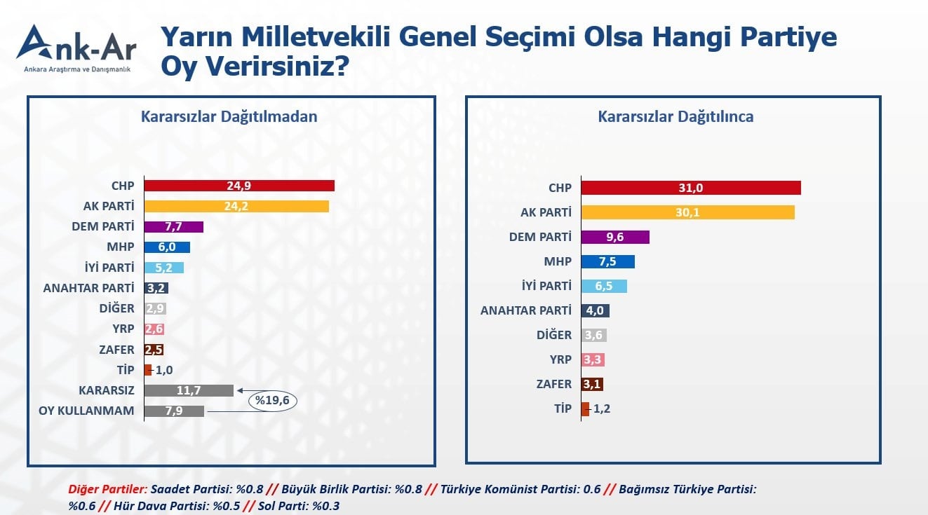 "Yarın milletvekili genel seçimi olsa hangi partiye oy verirsiniz?" sorusunun yöneltildiği ankette CHP yüzde 31 ile birinci oldu.