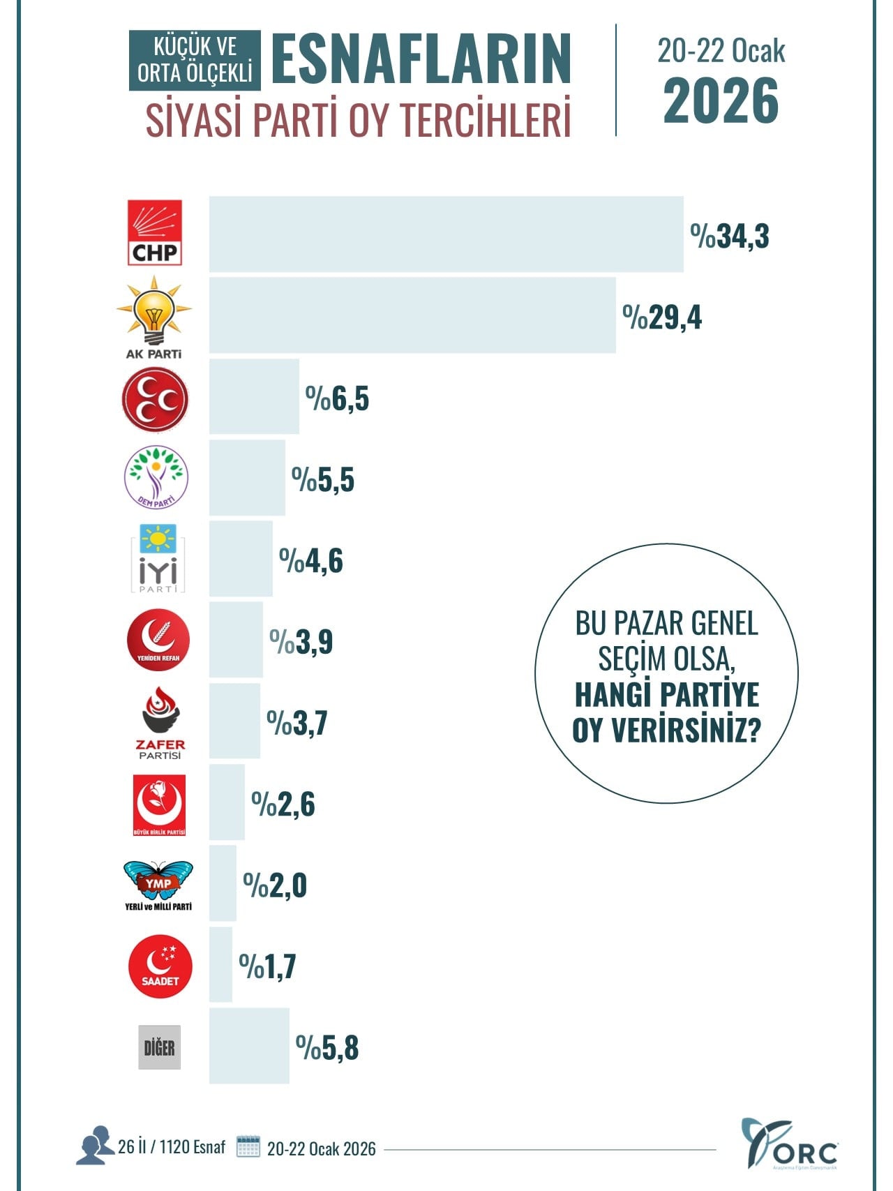 20-22 Ocak tarihleri arasında 26 ilde bin 120 küçük ve orta ölçekli esnafla yapılan ankette, esnaflara, "Bu pazar genel seçim olsa hangi partiye oy verirdiniz" sorusu yöneltildi. Katılımcıların cevaplarına göre CHP yüzde 34,3 ile birinci parti olurken AKP yüzde 29,4 ile ikinci parti oldu.