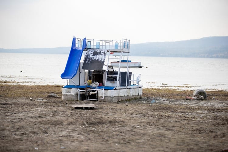 Suyun metrelerce çekildiği gölün kenarındaki iskelelerin büyük bölümü susuz kaldı, göldeki kayıklar tamamen karaya oturdu, toprakta çatlaklar oluştu.