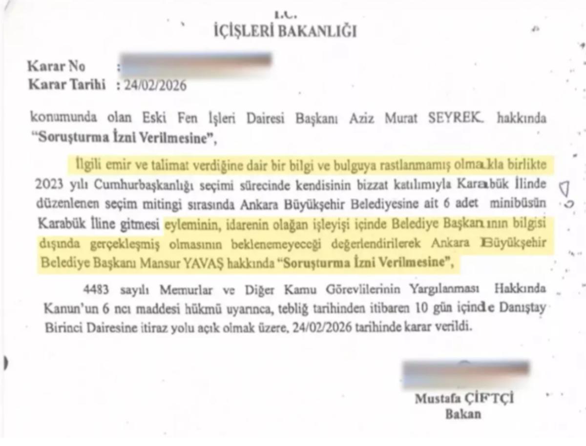 SORUŞTURMA İZNİ VERİLDİBakanlık bünyesindeki Mülkiye Müfettişleri tarafından yapılan değerlendirmenin ardından, İçişleri Bakanı Mustafa Çiftçi imzasıyla 24 Şubat 2026 tarihinde soruşturma izni verildi.