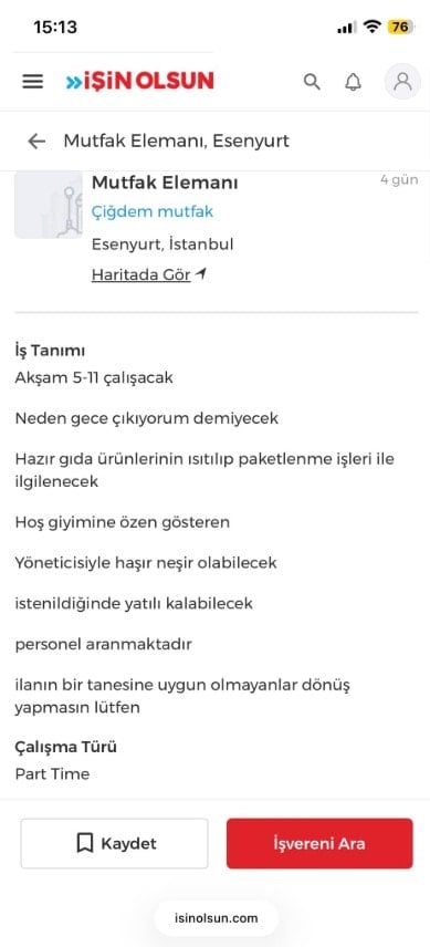 İstanbul'un Esenyurt ilçesinde faaliyet gösteren "Çiğdem Mutfak" isimli işletmenin "mutfak elemanı" ilanında yer alan bazı ifadeler tepki çekti. Part-time olarak akşam 17.00-23.00 saatleri arasında çalışacak personel aranan ilanda, adaylardan "neden gece çıkıyorum demeyecek" şeklinde bir şart talep edilmesi eleştirilere neden oldu.