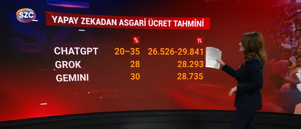 Milyonların merakla beklediği asgari ücret içinse Sözcü TV; ayrıntılı bilgiler sunarak Chat GPT, Gemici ve Grok'a asgari ücretin ne kadar olacağını sordu.