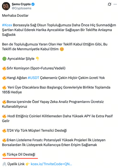 FENOMENLER TÜRKÇE DİL DESTEĞİNİ ÖNE ÇIKARIYORKCEX'in SPK tarafından engellenmesine rağmen bazı kripto fenomenleri platformu sosyal medyada tanıtmayı sürdürüyor. Paylaşımlarında özellikle KCEX'in Türkçe dil desteği sunmasını öne çıkaran fenomenler, takipçilerini platforma yönlendiriyor. Uzmanlar, bu tür tanıtımlarda yer alan fenomenlerin izinsiz sermaye piyasası faaliyeti kapsamında değerlendirilebileceğini ve hukuki sorumluluk doğabileceğini vurguluyor. Mevzuata göre sermaye piyasasında izinsiz olarak faaliyette bulunan kişiler iki yıldan beş yıla kadar hapis ve beş bin günden on bin güne kadar adli para cezasıyla karşılaşabiliyor.