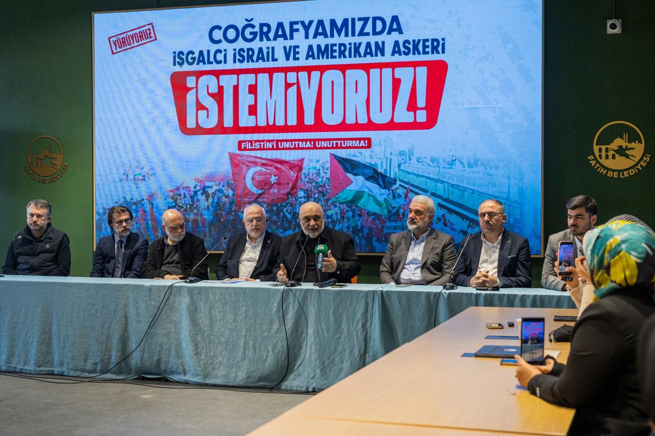 Toplantıda söz alan Filistin'e Destek Platformu Başkanı Osman Nuri Kabaktepe, “Siyonist rejimin Amerika ile birlikte İran’a ve bölgemize yönelik saldırılarının hem karşısında olduğumuzu hem de bölgemizi işgal etmeye yönelik çabalarının sadece bölgeye değil, dünyaya da istikrarsızlık getirdiğini, bu yapılanlara hayır dediğimizi ve durduğumuz yerin belli olması adına pazar günü hep beraber gördüğümüzü, körleşmediğimizi, duyduğumuzu, sağırlaşmadığımızı göstermek için tüm İstanbullu kardeşlerimizi yürüyüşümüze davet ediyoruz” şeklinde konuştu.