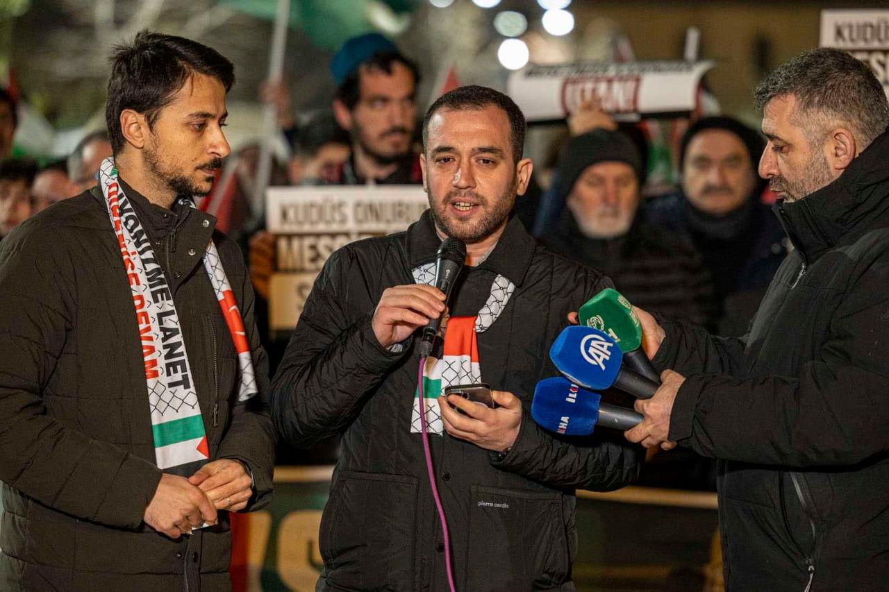 Tilavetin ardından basın açıklamasını okuyan Genç İHH Başkanı Mücahid Çankaya, savaşların en kanlı anında bile ibadethanelerin dokunulmazlığı olan mukaddes mekanlar olduğunun altını çizdi. Çankaya, "Birleşmiş Milletler İnsan Hakları Evrensel Beyannamesi’nden Cenevre Sözleşmeleri’ne kadar tüm uluslararası metinler şunu açıkça taahhüt eder: Her birey, ibadet etme ve dini vecibelerini yerine getirme hakkına sahiptir" dedi.
