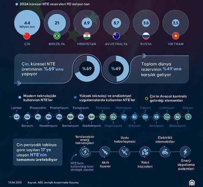 Rapora göre, grafit üretiminin yüzde 78'i Çin'de, kobaltın yüzde 76'sı Demokratik Kongo Cumhuriyeti'nde ve nikelin yüzde 60'ından fazlası da Endonezya'da üretiliyor. Kritik minerallerde olduğu gibi nadir toprak elementlerinin üretimi de belirli ülkelerde yoğunlaşıyor. Nadir toprak elementlerinin yaklaşık yüzde 40'ı ve küresel üretimin yüzde 69'u Çin'de bulunuyor. Bu rakamlar Çin'i nadir toprak elementleri üretiminde zirveye taşıyor.Öte yandan, kritik minerallerin belirli ülkelerde öne çıkması arz güvenliği açısından önemli riskler oluştururken, piyasa rekabeti de zayıflatıyor. Ayrıca artan taleple birlikte tekelleşme kritik ham maddenin fiyatlarında keskin yükselişlere de yol açıyor. Söz konusu durum stratejik kırılganlık yaratırken enerji savaşlarında yeni cehpeler oluşuyor.