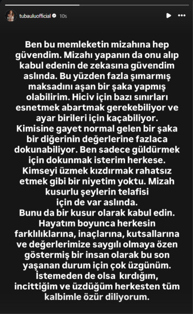 "MAKSADINI AŞAN BİR ŞAKA YAPMIŞ OLABİLİRİM"Ulu, paylaşımında mizaha olan inancını vurgulayarak, kullandığı ifadelerin amacını aşmış olabileceğini dile getirdi. Açıklamasında şu ifadelere yer verdi: