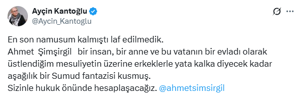 “En son namusum kalmıştı laf edilmedik. Ahmet Şimşirgil bir insan, bir anne ve bu vatanın bir evladı olarak üstlendiğim mesuliyetin üzerine ‘erkeklerle yata kalka’ diyecek kadar aşağılık bir Sumud fantazisi kusmuş. Sizinle hukuk önünde hesaplaşacağız.”