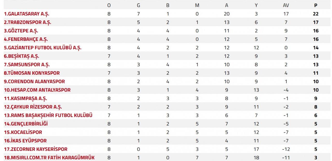 Süper Lig'de oynanan maçların ardından oluşan puan durumu şu şekilde: