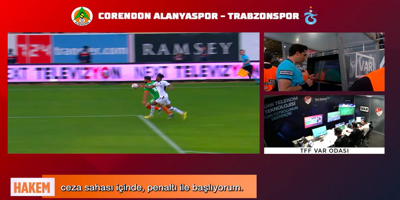 ALANYASPOR’UN KAZANDIĞI PENALTIAlanyaspor’un Trabzonspor’a karşı kazandığı penaltıda pozisyonu inceleyen Mehmet Türkmen’in savunma oyuncusunun elle oynadığı gerekçesiyle penaltı kararı verdiği görüldü.