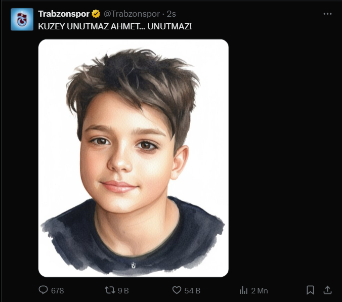 "KUZEY UNUTMAZ... AHMET... UNUTMAZ"Trabzonspor, Mattia Ahmet Minguzzi için yaptığı paylaşımda "KUZEY UNUTMAZ AHMET... UNUTMAZ!" dedi.