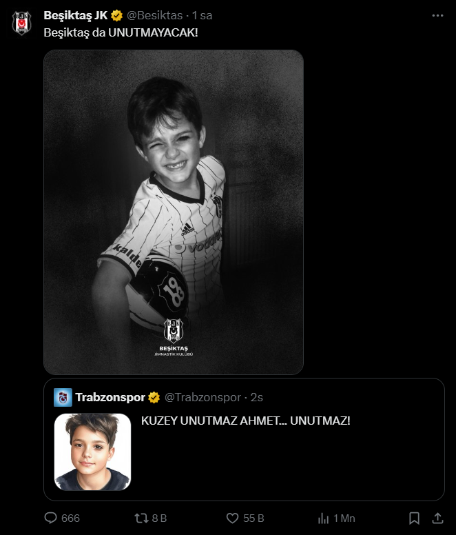 BEŞİKTAŞ DA UNUTMAYACAKBeşiktaş ise Trabzonspor’un bu paylaşımını alıntılayarak "Beşiktaş da UNUTMAYACAK!" sözlerini sarf etti.