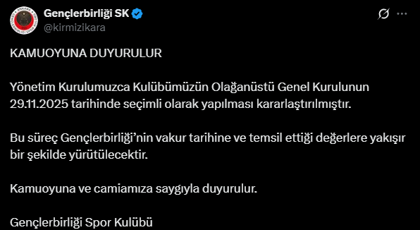 Kırmızı-siyahlı kulübün açıklamasında, "Yönetim kurulumuzca kulübümüzün olağanüstü genel kurulunun 29 Kasım 2025 tarihinde seçimli olarak yapılması kararlaştırılmıştır. Bu süreç, Gençlerbirliği'nin vakur tarihine ve temsil ettiği değerlere yakışır bir şekilde yürütülecektir." ifadelerine yer verildi.