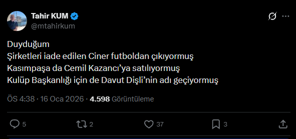 Tahir Kum paylaşımında “Duyduğum, şirketleri iade edilen Ciner futboldan çıkıyormuş... Kasımpaşa da Cemil Kazancı’ya satılıyormuş... Kulüp Başkanlığı için de Davut Dişli’nin adı geçiyormuş...” ifadelerini kullandı.