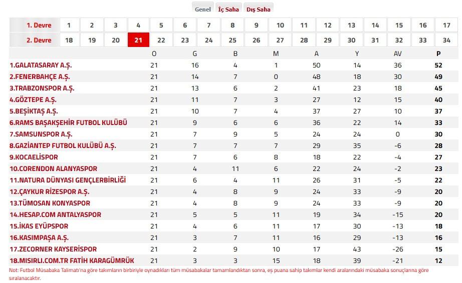 TAKIMLAR O G B M A Y AV P 1.GALATASARAY 21 16 4 1 50 14 36 52 2.FENERBAHÇE 21 14 7 0 48 18 30 49 3.TRABZONSPOR 21 13 6 2 41 23 18 45 4.GÖZTEPE 21 11 7 3 27 12 15 40 5.BEŞİKTAŞ 21 10 7 4 37 27 10 37 6.RAMS BAŞAKŞEHİR 21 9 6 6 36 22 14 33 7.SAMSUNSPOR 21 7 9 5 24 24 0 30 8.GAZİANTEP FK 21 7 7 7 29 35 -6 28 9.KOCAELİSPOR 21 7 6 8 18 22 -4 27 10.CORENDON ALANYASPOR 21 4 11 6 22 24 -2 23 11.NATURA DÜNYASI GENÇLERBİRLİĞİ 21 6 4 11 26 31 -5 22 12.ÇAYKUR RİZESPOR 21 4 8 9 24 33 -9 20 13.TÜMOSAN KONYASPOR 21 4 8 9 24 33 -9 20 14.HESAP.COM ANTALYASPOR 21 5 5 11 19 34 -15 20 15.İKAS EYÜPSPOR 21 4 6 11 17 30 -13 18 16.KASIMPAŞA 21 3 7 11 16 29 -13 16 17.ZECORNER KAYSERİSPOR 21 2 9 10 17 43 -26 15 18.MISIRLI.COM.TR FATİH KARAGÜMRÜK 21 3 3 15 18 39 -21 12