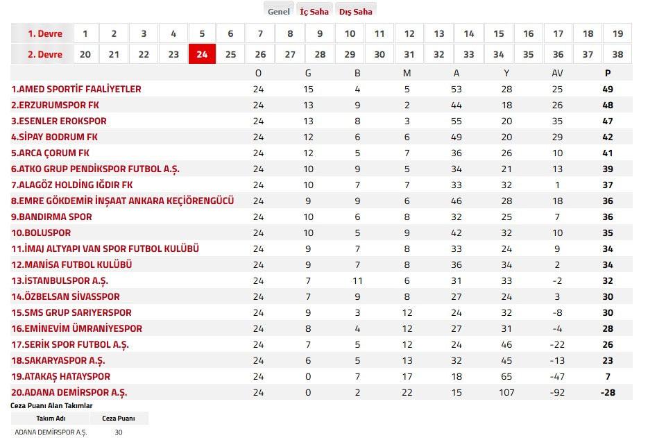 TAKIMLAR O G B M A Y AV P 1.AMED SPORTİF FAALİYETLER 24 15 4 5 53 28 25 49 2.ERZURUMSPOR FK 24 13 9 2 44 18 26 48 3.ESENLER EROKSPOR 24 13 8 3 55 20 35 47 4.SİPAY BODRUM FK 24 12 6 6 49 20 29 42 5.ARCA ÇORUM FK 24 12 5 7 36 26 10 41 6.ATKO GRUP PENDİKSPOR 24 10 9 5 34 21 13 39 7.ALAGÖZ HOLDİNG IĞDIR FK 24 10 7 7 33 32 1 37 8.EMRE GÖKDEMİR İNŞAAT ANKARA KEÇİÖRENGÜCÜ 24 9 9 6 46 28 18 36 9.BANDIRMASPOR 24 10 6 8 32 25 7 36 10.BOLUSPOR 24 10 5 9 42 32 10 35 11.İMAJ ALTYAPI VANSPOR FK 24 9 7 8 33 24 9 34 12.MANİSA FK 24 9 7 8 36 34 2 34 13.İSTANBULSPOR 24 7 11 6 31 33 -2 32 14.ÖZBELSAN SİVASSPOR 24 7 9 8 27 24 3 30 15.SMS GRUP SARIYERSPOR 24 9 3 12 24 32 -8 30 16.EMİNEVİM ÜMRANİYESPOR 24 8 4 12 27 31 -4 28 17.SERİKSPOR 24 7 5 12 24 46 -22 26 18.SAKARYASPOR 24 6 5 13 32 45 -13 23 19.ATAKAŞ HATAYSPOR 24 0 7 17 18 65 -47 7 20.ADANA DEMİRSPOR 24 0 2 22 15 107 -92 -28Not: Adana Demirspor'un 30 puanı silinmiştir.