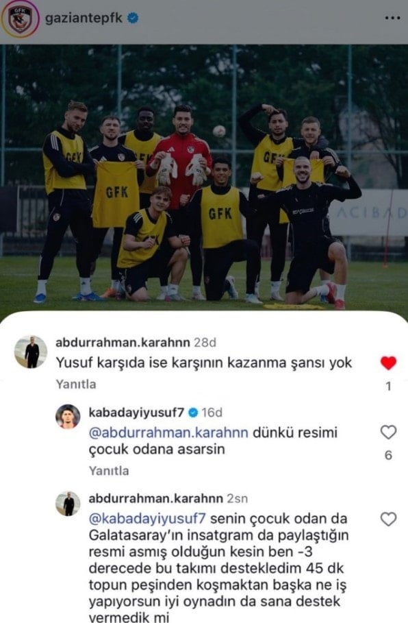 Deneyimli savunmacı, kulübün sosyal medya hesabında yapılan paylaşımın altında bir taraftar ile diyaloğa girerken ifadeler gündem oldu. Kulübün yaptığı antrenman fotoğraflı paylaşıma “Yusuf karşısında ise karşısının kazanma şansı yok” ifadelerini kullanan taraftar, Yusuf Kabadayı'ı çileden çıkardı.