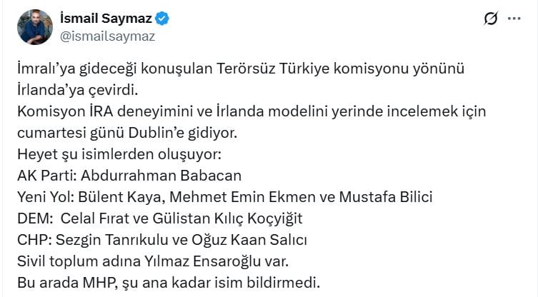 "İmralı’ya gideceği konuşulan Terörsüz Türkiye komisyonu yönünü İrlanda’ya çevirdi. Komisyon İRA deneyimini ve İrlanda modelini yerinde incelemek için cumartesi günü Dublin’e gidiyor. Heyet şu isimlerden oluşuyor: AK Parti: Abdurrahman Babacan Yeni Yol: Bülent Kaya, Mehmet Emin Ekmen ve Mustafa Bilici DEM: Celal Fırat ve Gülistan Kılıç Koçyiğit CHP: Sezgin Tanrıkulu ve Oğuz Kaan Salıcı Sivil toplum adına Yılmaz Ensaroğlu var. Bu arada MHP, şu ana kadar isim bildirmedi."