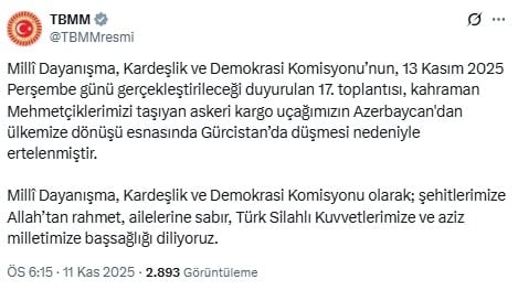 "Millî Dayanışma, Kardeşlik ve Demokrasi Komisyonu’nun, 13 Kasım 2025 Perşembe günü gerçekleştirileceği duyurulan 17. toplantısı, kahraman Mehmetçiklerimizi taşıyan askeri kargo uçağımızın Azerbaycan'dan ülkemize dönüşü esnasında Gürcistan’da düşmesi nedeniyle ertelenmiştir.