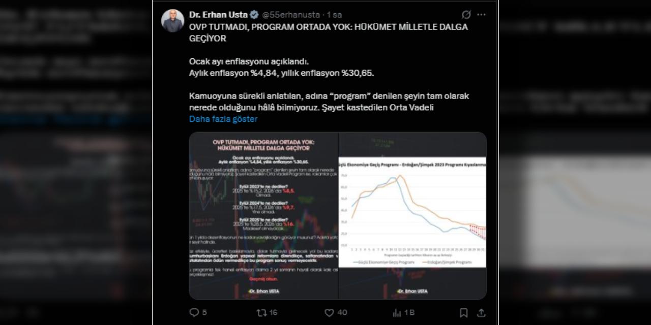 "Ocak ayı enflasyonu açıklandı. Aylık enflasyon yüzde 4,84, yıllık enflasyon yüzde 30,65. Kamuoyuna sürekli anlatılan, adına 'program' denilen şeyin tam olarak nerede olduğunu hâlâ bilmiyoruz. Şayet kastedilen Orta Vadeli Program ise rakamlar çok net konuşuyor: