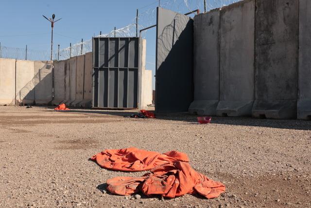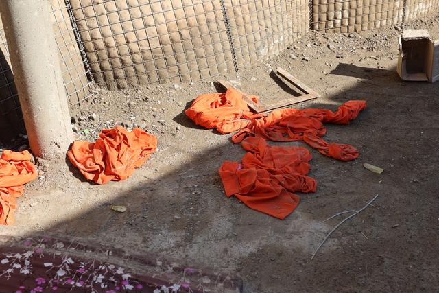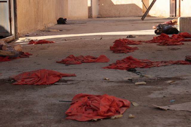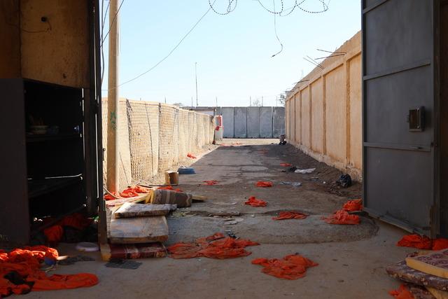 KAMUFLAJLARI BIRAKMIŞLARTerör örgütünce serbest bırakılan DEAŞ mensuplarının, tutuklulara giydirilen ve kaçarken çıkardıkları turuncu elbiseleri hapishanenin çevresine attığı görülüyor.
