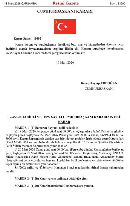 Toplu taşıma araçlarındaki ücretsiz kullanım detaylarına da yer verilen kararda, "20 Mart 2026 Cuma günü saat 00:00'dan başlayarak 22 Mart 2026 Pazar günü saat 24:00'a kadar; Başkentray, Marmaray, İZBAN, Sirkeci-Kazlıçeşme Raylı Sistem Hattı, Gayrettepe-İstanbul Havalimanı-Arnavutköy Metro Hattı seferleri ile belediyelerce yürütülen toplu taşıma hizmetleri ücretsiz olacaktır." denildi.