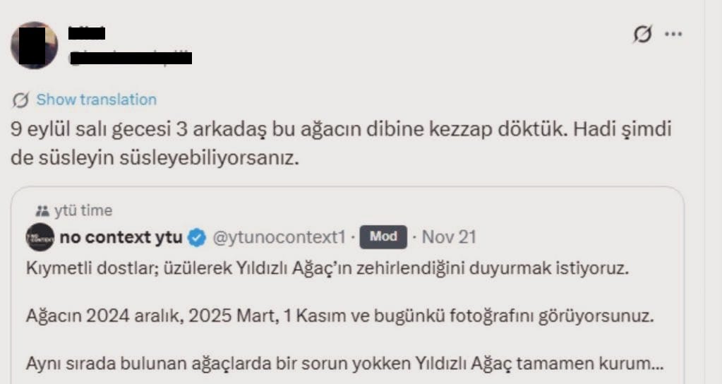 KEZZAPLA ZEHİRLENDİ İDDİASIHer yıl yılbaşı döneminde gerici grupların tepkisini çeken ağacın bu sefer kezzap dökülerek zehirlendiği ve kurutulduğu iddia edildi. Ağaçla ilgili olarak resmi makamlardan henüz bir açıklama yapılmadı. Öğrenciler ağacın kezzap ile zehirlendiğini iddia ediyor.