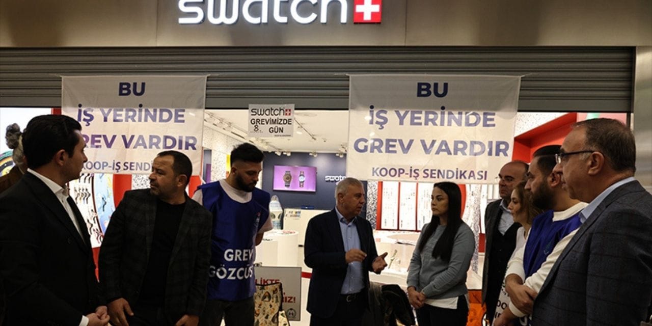 15 MAĞAZADA İŞ BIRAKMA EYLEMİ SÜRÜYORTürk-İş konfederasyonuna bağlı Koop-İş Sendikası ile işveren arasında yürütülen toplu iş sözleşmesi görüşmelerinin tıkanması üzerine, Swatch Group Türkiye bünyesindeki 15 mağazada çalışanlar 14 gündür grevde.