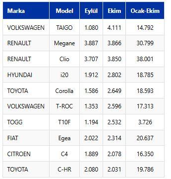 Ekim ayında model bazında satışlarda Taigo 4 bin 111 ile Türkiye’de en çok satılan otomobil oldu. İkinci sırada 3 bin 866 ile Renault Megane Sedan bulunurken, 3 bin 850 ile Renault Clio listede üçüncü sırada yer aldı.