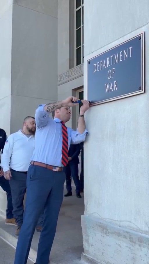 Bakanlığın sosyal medya hesaplarında paylaşılan görüntülerde, ABD Savunma Bakanı Pete Hegseth'in "Savaş Bakanlığı" yazılı bronz levhalardan birini bizzat vidaladığı görüldü. Hegseth, "Eski tabelaları değiştirmek istedik çünkü bu kapıdan giren herkesin, bu kuruluşun isminin değiştirilmesi konusunda son derece ciddi olduğumuzu bilmesini istiyoruz." dedi.
