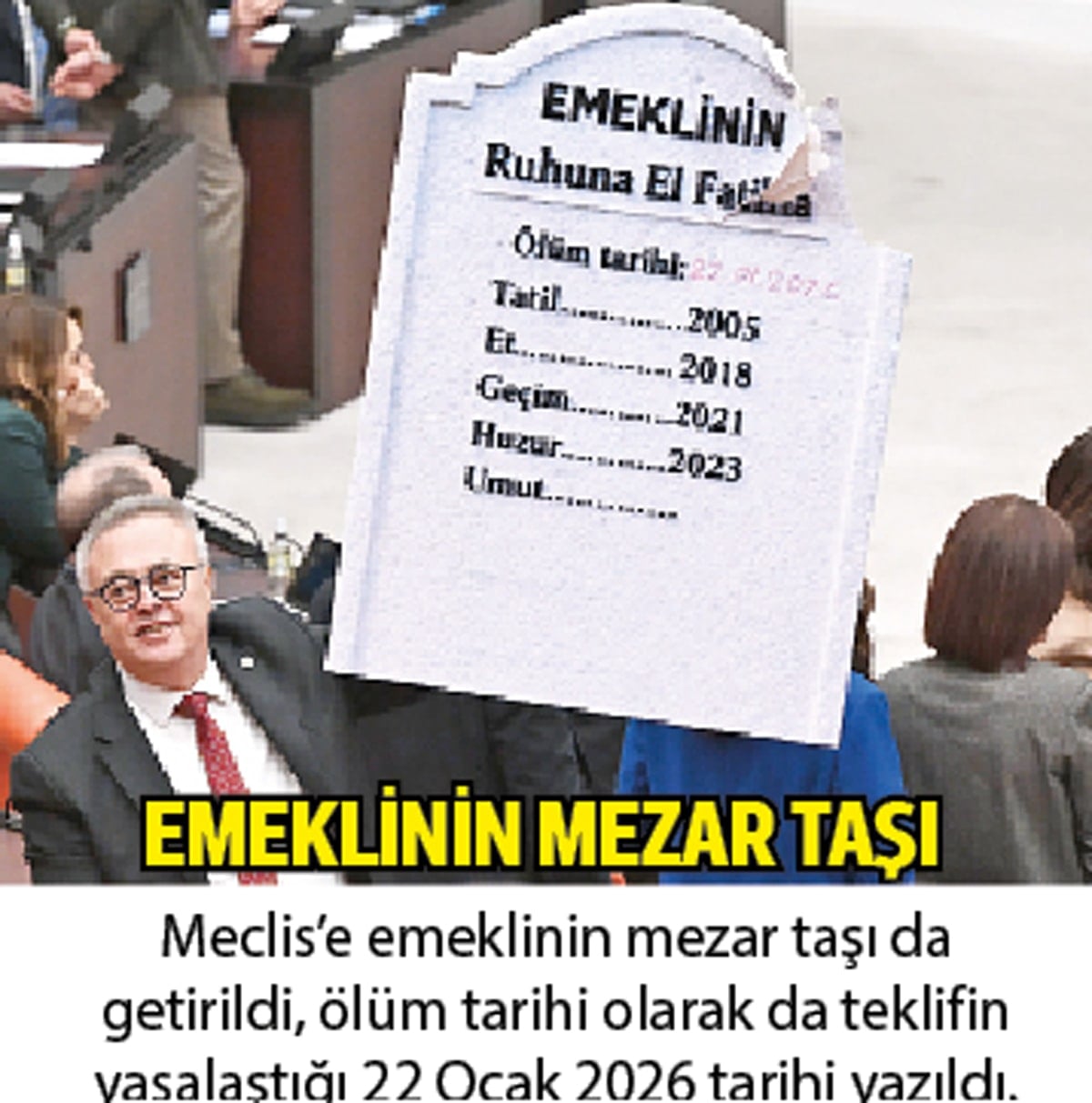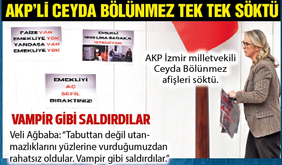 AKP’li Leyla Şahin Usta, CHP’li vekillerin önünü kesti. AKP’liler de kürsüyü işgal etti. Ağbaba “Tabuta ancak vampirler saldırır” derken, CHP’liler sıralarında “Faize var, emekliye yok, yandaşa var, emekliye yok” pankartı açtı.