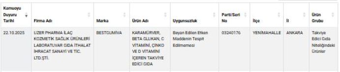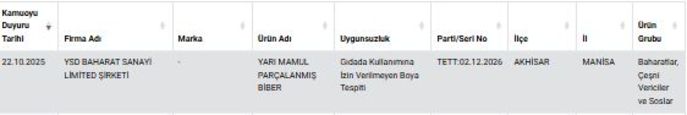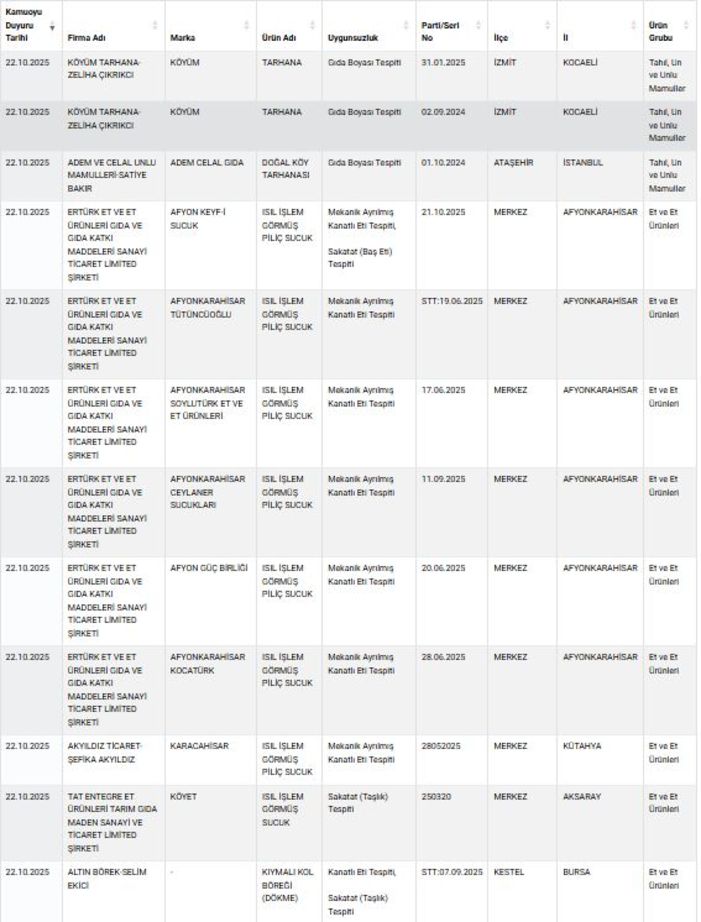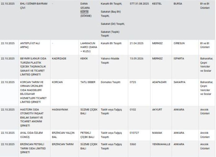Taklit ve tağşiş yapılan gıdalar listesinin 'Aynı Değeri Taşımayan Madde Eklenmesi' bölümünde 19 yeni hileli ürün eklenirken taklit ve tağşişin 'Temel Özelliği Etkileyen İçerik Eksikliği' bölümüne 1 yeni hileli ürün eklendi. 'Sağlığı Tehlikeye Düşürecek Gıdalar' listesine de 1 ürün daha eklendi.