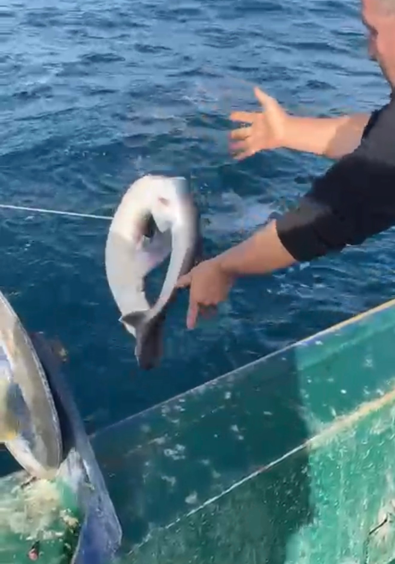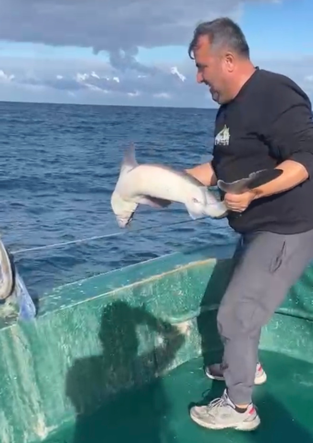 Tekne sahibi Kenan Kaya, güçlükle tuttuğu köpek balığını kısa süre sonra yeniden denize bıraktı.