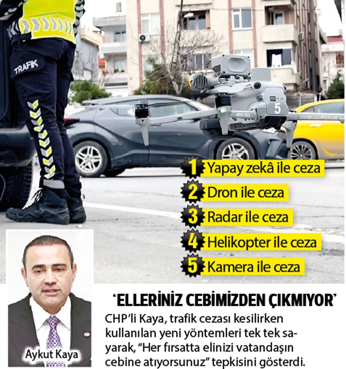 CHP’li Aykut Kaya, “Trafiğe çıkan vatandaşımızın cebindeki parayı alabilmek için bütün imkânları seferber ediyorsunuz; yapay zekâyla ceza kesiyorsunuz. Vatandaşın cebindeki parayı almaya gelince varsınız ama cebine para koymaya gelince yoksunuz” ifadelerini kullandı.