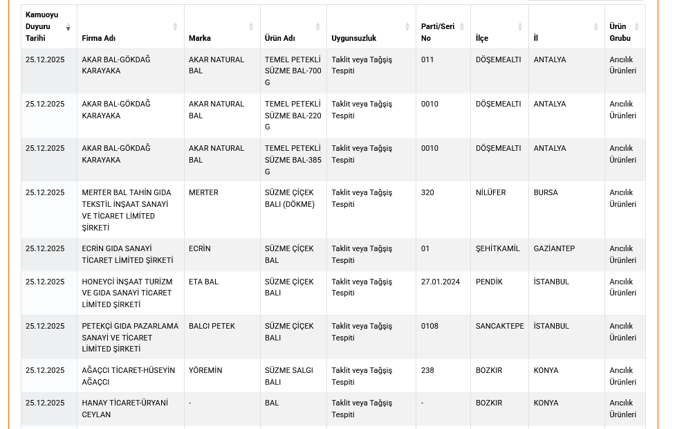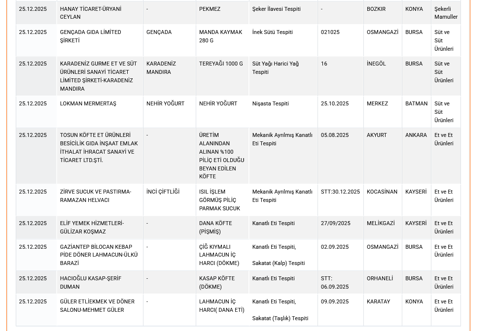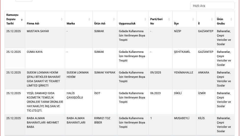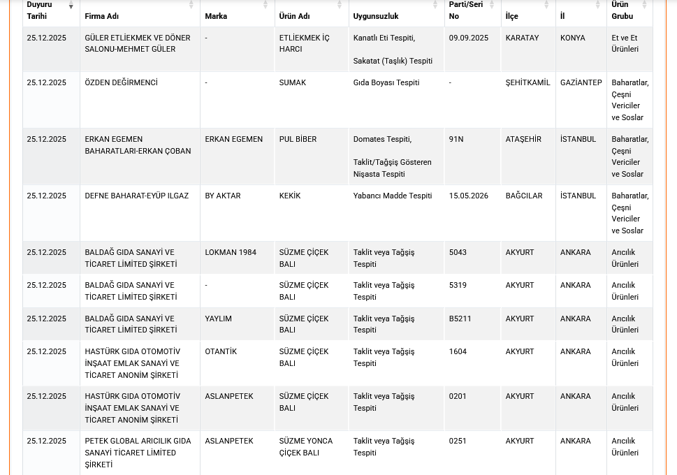 Tarım ve Orman Bakanlığı, 25 Aralık 2025 itibarıyla "Sağlığı tehlikeye düşürecek gıdalar" ve "Taklit veya Tağşiş Yapılan Gıdalar" listesini güncelledi. Yapılan son laboratuvar incelemeleri sonucunda, Türkiye’nin dört bir yanında satılan ürünlerde pek çok tehlike ve hille tespit edildi. 5 markanın gıdada kullanılmasına izin verilmeyen boya tespit edildi.