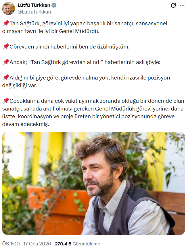 İYİ Parti Kocaeli Milletvekili Lütfü Türkkan, Tan Sağtürk'ün görev değişikliğine dair sosyal medya hesabından paylaşım yaptı.