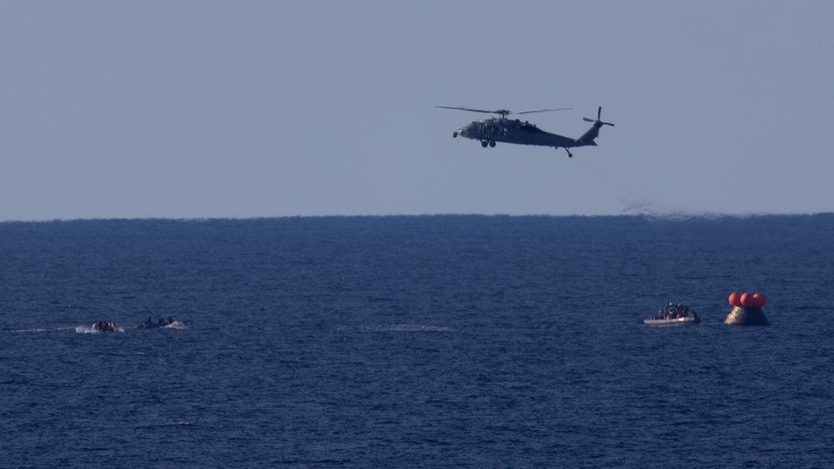 Önce botlara alınan astronotlar, daha sonra helikopterle yakında bekleyen bir gemiye getirildi.