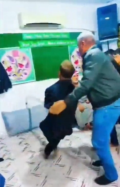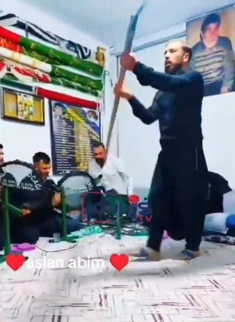 Söz konusu görüntülerde, bir kişinin küreğin ucunu karnına batırıp sapını da duvara vurduğu görüldü. Yanında bulunanlar ise şahsın zarar görmemesi için duruma müdahale edip, elindeki küreği aldı.,