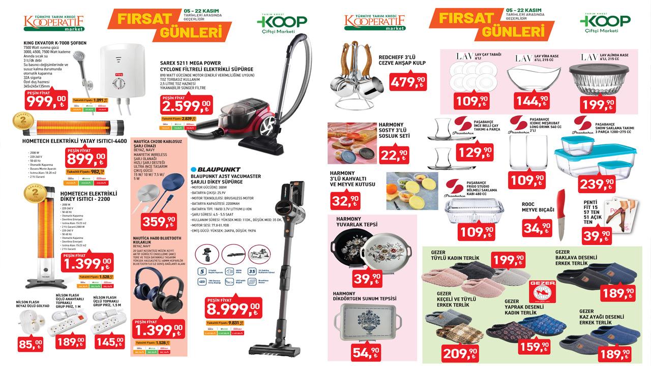 Tarım Kredi Market'te 5 Kasım tarihinde başlayacak ve 22 Kasım'a kadar devam edecek olan kampanyasında; 3'lü cezve ahşap kulp, 3'lü sosluk seti, 3'lü kahvaltı ve meyve kutusu, 6'lı çay tabağı, 6'lı kase, 4 parça ince belli çay takımı, 2'li meşrubat bardağı, 3 parça saklama takımı, bölmeli saklama kabı, meyve bıçağı, yuvarlak tepsi, dikdörtgen sunum tepsi, tüylü kadın terlik, keçeli ve tüylü erkek terlik, baklava desenli erkek terlik, yaprak desenli kadın terlik, kaz ayağı desenli erkek terlik indirimli fiyatlarla satışa sunulacak.