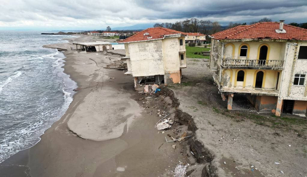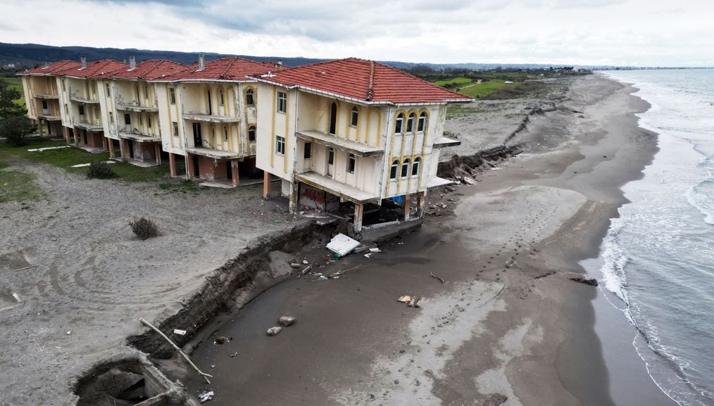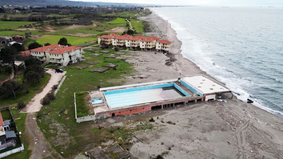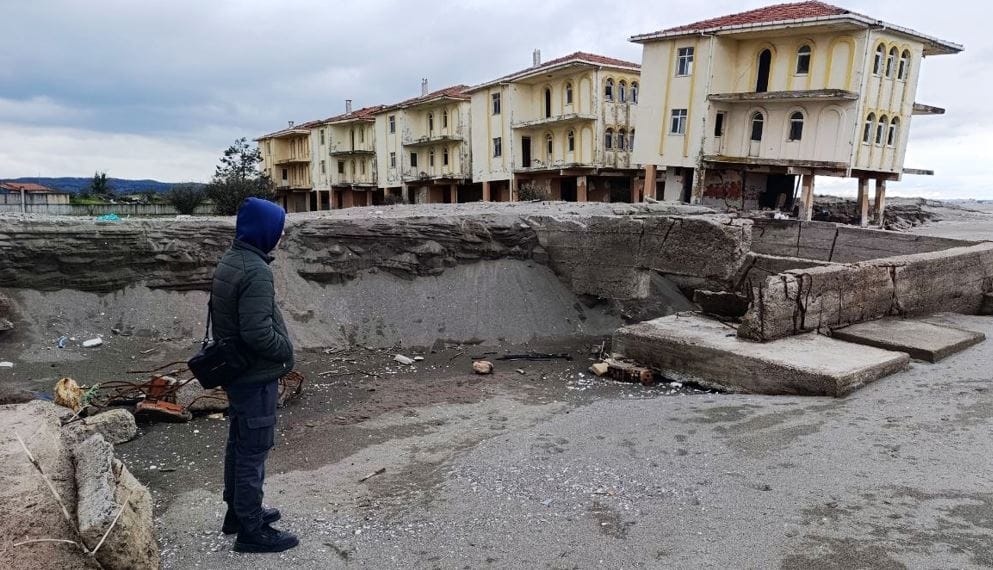 "DENİZ İÇERİYE GİRDİ VE SIFIRA KADAR GELDİ"Kıyı erozyonunun tahrip ettiği eski tatil köyü ile ilgili bilgi veren Kır, "Özel bir imarla tatil köyü ruhsatı alınarak 1985 yılında inşaatına başlandı. 1995 yıllarında da inşaatı tamamlandı. Turizme etki edecek şekilde hizmete açılacağı zamanlar, kıyı erozyonu da kendini gösterdi. Bu sahilde deniz en az 100 metre ilerideydi. Bugün ise deniz içeriye girdi ve sıfıra kadar geldi. Buraya bir tedbir alınması da gerekiyordu." diye konuştu.