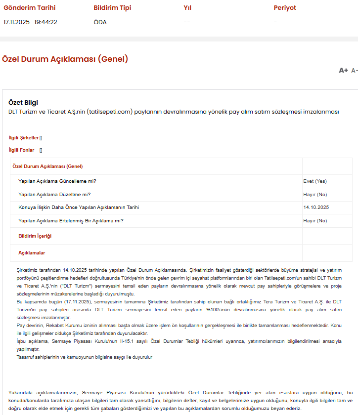 “17.11.2025 tarihinde sermayesinin tamamına Şirketimiz tarafından sahip olunan bağlı ortaklığımız Tera Turizm ve Ticaret A.Ş. ile DLT Turizm’in pay sahipleri arasında, DLT Turizm sermayesini temsil eden payların yüzde 100’ünün devralınmasına yönelik pay alım satım sözleşmesi imzalanmıştır.”