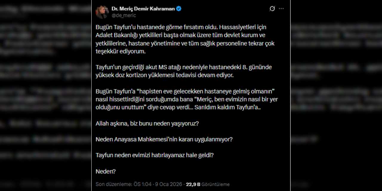 TAYFUN KAHRAMAN EVİNİ HATIRLAYAMAZ HALE GELDİ: EŞİ ANLATTISosyal medyasından yaptığı paylaşımda öncelikle Adalet Bakanlığı yetkilileri, tüm devlet kurum ve yetkililerine, hastane yönetimine ve tüm sağlık personeline teşekkür eden Meriç Demir Kahraman, Tayfun Kahraman'ın son durumunu tek cümleyle özetledi.