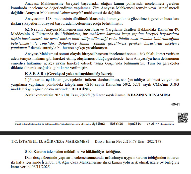 "Anayasa Mahkemesi somut olayda bireysel başvuru incelemesi sonucu hak ihlali kararı verirken adeta temyiz makamı gibi hareket etmiş, oluşturmuş olduğu gerekçede hem Anayasa'ya hem de kanunun emredici hükmüne açıkça aykırı hareket ederek "Yetki Gaspı"nda bulunmuştur."