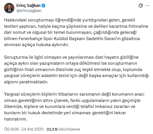 "AÇIKÇA HUKUKA AYKIRI""Hakkındaki soruşturmayı öğrendiğinde yurtdışından gelen, gerekli testleri yaptıran, haliyle kaçma şüphesine ve delilleri karartma ihtimaline dair somut ve olgusal bir temel bulunmayan, çağrıldığında geleceği bilinen Fenerbahçe Spor Kulübü Başkanı Sadettin Saran’ın gözaltına alınması açıkça hukuka aykırıdır.