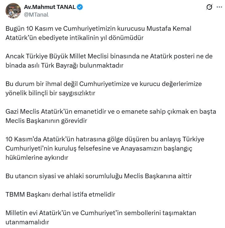 "Bugün 10 Kasım ve Cumhuriyetimizin kurucusu Mustafa Kemal Atatürk’ün ebediyete intikalinin yıl dönümüdür Ancak Türkiye Büyük Millet Meclisi binasında ne Atatürk posteri ne de binada asılı Türk Bayrağı bulunmaktadır. Bu durum bir ihmal değil Cumhuriyetimize ve kurucu değerlerimize yönelik bilinçli bir saygısızlıktır."