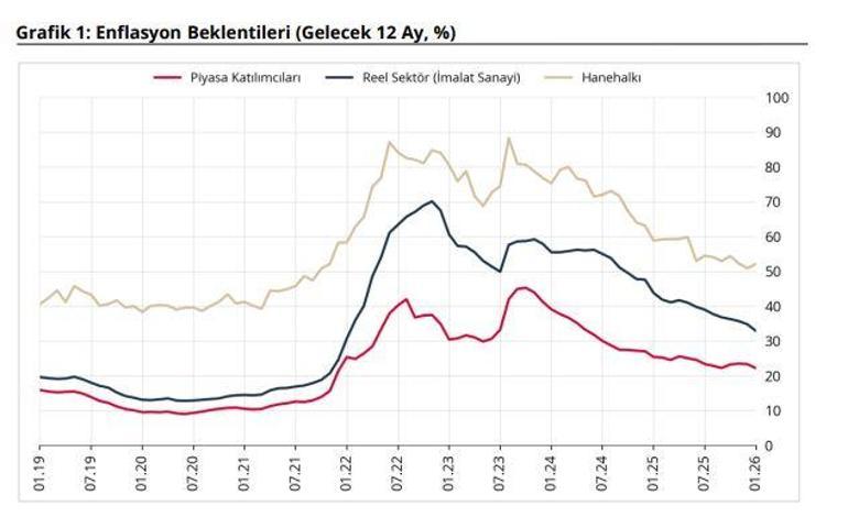 TCMB, Ocak 2026 dönemine ilişkin sektörel enflasyon beklentilerini açıkladı. Buna göre; 2026 yılı Ocak ayında 12 ay sonrası yıllık enflasyon beklentileri bir önceki aya göre piyasa katılımcıları için 1,15 puan azalarak yüzde 22,20 seviyesine, reel sektör için 1,90 puan azalarak yüzde 32,90 seviyesine gerilerken; hanehalkı için 1,18 puan artarak yüzde 52,08 seviyesine yükseldi. Gelecek 12 aylık dönemde enflasyonun düşeceğini bekleyen hanehalkı oranı bir önceki aya göre 1,64 puan artarak yüzde 26,17 seviyesinde gerçekleşti.