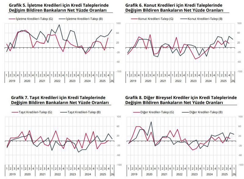 Aynı dönemde, konut ve taşıt kredi talebinin zayıflayarak devam edeceği, diğer bireysel kredi talebindeki artışın ise sınırlı zayıflayarak devam edeceği beklenmektedir.