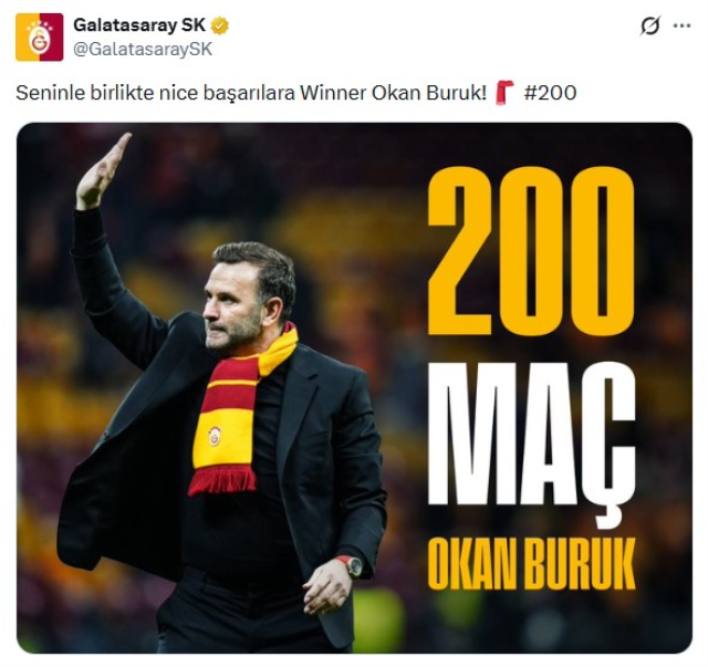 ''SENİNLE NİCE BAŞARILARA WINNER OKAN BURUK''Yapılan paylaşımda, "Seninle birlikte nice başarılara Winner Okan Buruk!" denilerek, başarılı teknik adamın sarı-kırmızılı takımın başında 200 maça çıktığı vurgulandı. Bu paylaşım kısa süre içerisinde çok sayıda beğeni ve yorum alarak günün en çok konuşulan paylaşımlarından biri oldu.