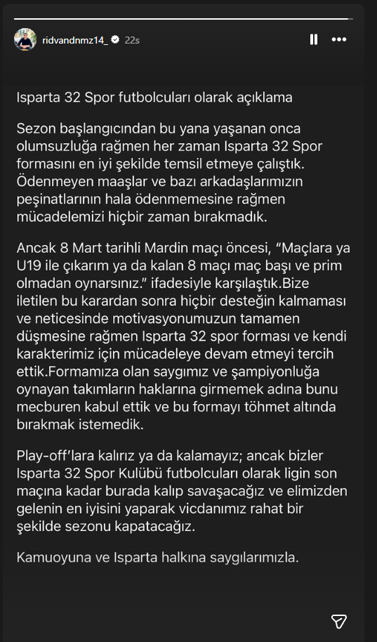 Futbolcular, 8 Mart’ta oynanan Mardin maçı öncesi nasıl tehdit edildiklerini de açıkladılar. Ispartalı oyuncular kendilerine “Ya U19 ile çıkarım ya da kalan maçları primsiz oynarsınız” denildiğini belirterek motivasyonlarının düştüğünü, buna rağmen kulübün ve formanın onurunu korumak için sahaya çıkmaya devam ettiklerini açıkladı.